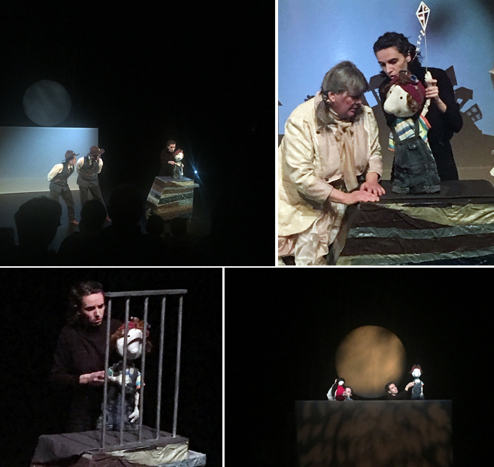 La scène comporte des ombres chinoises avec en plus un cercle représentant la lune. D’ailleurs, le cercle m’a rappelé celui qu’on pouvait voir dans des spectacles de Pink Floyd à une certaine époque. À part ceci, une échelle et un chariot complètent le tout. Les marionnettes et accessoires ont été conçus par Manon Doran et Pier Rodier.